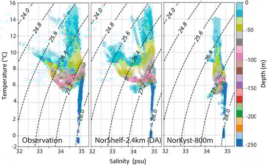 The continental slope off Norway is a transport passage for the warm-saline Norwegian Atlantic Current (NwAC) towards the Arctic Ocean. Here, the current is primarily guided by the continental slope. Hence, mesoscale or sub-mesoscale eddies are considered the primary mechanism in lateral heat transport. Indeed, observations and models indicate strong flow field variability in this region [45,54]. The complex flow field and geometry of coastal and fjord systems entails not only a high spatial resolution of the ocean circulation model but also associated high-resolution observations and forcing fields, e.g., from numerical weather prediction models. Data assimilation (DA) using near-real-time observations is much needed to improve predictive skills in such models. Accordingly, to better understand the physics of the ocean along the coastal zone of the LoVe region, meteorological and oceanographic data collected by the three gliders were assimilated into a regional version of the ROMS model (NorShelf-2.4km). The NorShelf-2.4km model already assimilates data from diverse sources, e.g., sea surface temperature, high-frequency radars, hydrography provided by CTD sections from occasional research cruises, FerryBox data, and ARGO floats. This model runs operationally at the Norwegian Meteorological Institute (MET Norway) using four-dimensional variational data assimilation (4D-Var [55]). ROMS provides several formulations of 4D-Var; NorShelf-2.4km uses the physical space analysis system (PSAS). Within this setup, the assimilation window was two days, which was chosen based on previous 4D-Var experiments on the coast of Norway with a 2.4km resolution [56]. To benefit from the improved hydrography and circulation that the DA in NorShelf-2.4km provides, a very high-resolution unstructured model was nested as a grid into the NorShelf-2.4km [57]. This allowed for the introduction of a large number of rivers (more than 7000 large and small rivers) and positioned them correctly on the coastline. Here, we adopted a 3D version of the Finite-Volume Community Ocean Model (FVCOM [58]) and imposed a variable spatial resolution from 30 m along the coast and straits to 2.4 km at the boundaries. Hence, by imposing high-quality boundary conditions, an enhanced picture of the ambient hydrodynamical processes was achieved. In order to assess the skill of NorShelf-2.4km compared with MET Norway’s high-resolution NorKyst-800m forecast model, which does not employ data assimilation, we compared T-S diagrams.