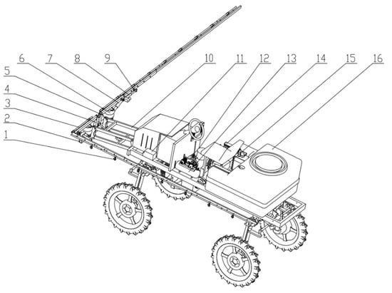 High-clearance sprayer structure 1. nozzle 2. suspension base 3. sprinkler 4. support bracket 5. pin shaft 6. air spring 7. damper 8. electric linear actuator 9. spray boom 10. parallelogram mechanism 11. accumulator 12. additional air chamber 13. air compressor 14. distributing valve 15. pesticide pump 16. pesticide box.