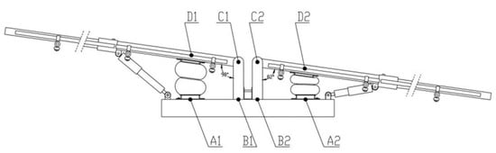 Operating diagram of air spring using the (A1, A2) the intersection point of air spring center line and base, (B1, B2) the intersection of fixed bracket vertical center line and base, (C1, C2) the center point of cross section of pin shaft, and (D1, D2) the intersection point of air spring center line and spray boom center line.