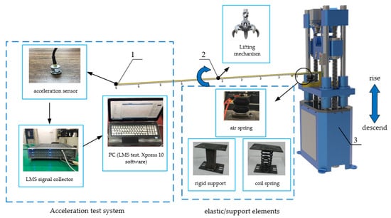 The transient and sinusoidal excitations were applied to the spray boom-air suspension system, and their dynamic response characteristics were analyzed. In addition, the spray boom-coil spring suspension and spray boom-rigid support systems were divided into two control groups. The spring and support were installed in the same position to keep the spray boom in a horizontal state when stationary. The specific procedure for applying transient excitation is presented as follows: (1) use the lifting method []; (2) apply a pulling force at the centroid of the spring boom; (3) adjust the spray boom to rotate forward by 8°; (4) remove the pulling force after the spray boom becomes stable. After that, an acceleration sensor recorded the acceleration change at the end of the spray boom with time.