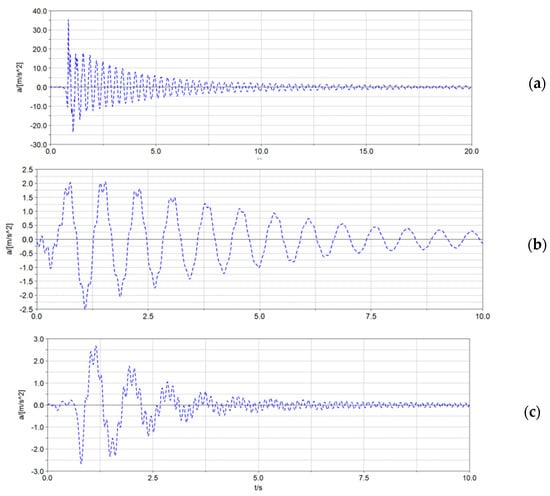 Time−domain response curve of the acceleration at the end of the spray boom. (a) spray boom-rigid support system; (b) spray boom-coil spring system; (c) spray boom-air spring system.