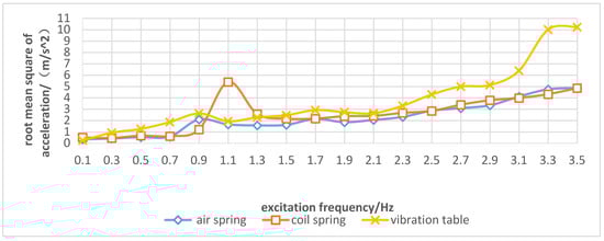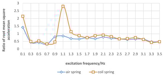 When sinusoidal excitation was applied to the spray boom, the frequency-domain response curve of RMS1 and RMS2 under different elastic elements are illustrated in Figure 7. Figure 8 presents the ratio of RMS1 and RMS2 under different elastic elements. When the sinusoidal excitation frequency was in the range of 0.3–3.5 Hz, the air spring kept the ratio of RMS1 and RMS2 less than 1, thus indicating an optimal vibration isolation effect. When the excitation frequency was 0.1 Hz, the air and coil springs amplified the vibration. The underlying cause was the slow spring deformation and negligible dynamic stiffness, which was not conducive to damping. Hence, the vibration suppression effect was not completely played. When the spray boom was equipped with the coil spring, the vibration became stronger at the sinusoidal excitation frequency of 1.1 Hz, and RMS1 was 2.8 times that of RMS2. This occurred because the sinusoidal excitation frequency was close to the system’s natural frequency. At this point, resonance was observed in the spray boom-coil spring system. Owing to the installation of an air spring, RMS1 did not exhibit a sudden increase trend, the main reason is that the air spring had ideal nonlinear characteristics, and its elastic characteristic is gentle and little change, thereby indicating that the resonance was weakened by the air spring under the sinusoidal excitation frequency.