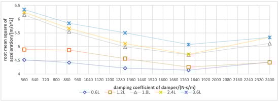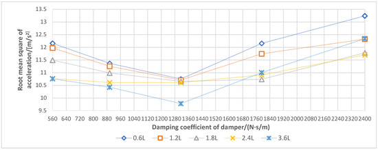The vibration of the spray boom during the operation in the dry field is illustrated in Figure 10. The effect of the damper damping coefficient on the spray boom vibration was the same as that in the water field operation. When other conditions remained unchanged, the increase in the damping coefficient triggered the increase in the suspension system stiffness and damping. The excessive damping of the damper influenced the vibration reduction in the air spring. Hence, under the volume of each additional air chamber, the vibration intensity of the spray boom initially decreased, and then increased with the increasing damping coefficient. However, the optimal damping coefficient in terms of the dry field was 1316 N·s/m, less than that under the water field condition. This is owing to the faster and larger frequency and amplitude of excitation in the dry field system. A smaller damping coefficient can produce sufficient damping to suppress vibration.