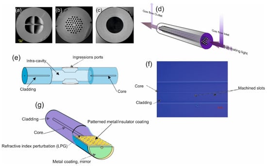 Thus, these types of optical fibre gas sensors needs to have a “chamber” or cavity into which a sample of gas can be placed and then analysed. A gas sensing intra-cavity can be fabricated within the fibre [19,21] or as a separate external cavity [20]. Examples of the former use photonic crystal fibre (PCF), in which holes within the fibre constitute the cavities [23,24]. Some examples are illustrated in Figure 1a–d. The “grapefruit” fibre in Figure 1a has a core with a very small diameter. The guided mode permeates into the air gaps. Figure 1e shows a capillary, hollow optical fibre that has a gas inlet and outlet facility, spliced onto a standard single-mode fibre (SMF) [46]. This fabrication constitutes the classical spectroscopy format, in which gas is illuminated and the resulting spectra is detected and analysed. A further example involves micro-machining a section of a SMF to create a cavity in close proximity to the core of the fibre [47,48]. Structuring the cavity involves femtosecond-inscription followed by HF etching, as shown in Figure 1f.