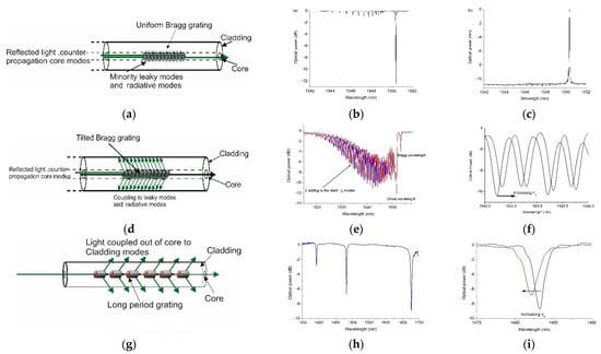 The three types of fibre grating sensors and their spectral response. (a) Schematic of fibre Bragg grating. (b,c) A typical fibre Bragg grating spectral response in reflection and transmission. (d) Schematic of tilted fibre Bragg grating. (e,f) A typical tilted fibre Bragg grating spectral response in transmission and the response to change in the surrounding medium index. (g) Schematic of long period grating. (h,i) Spectral responses in transmission and the response to change in the surrounding mediums index.
