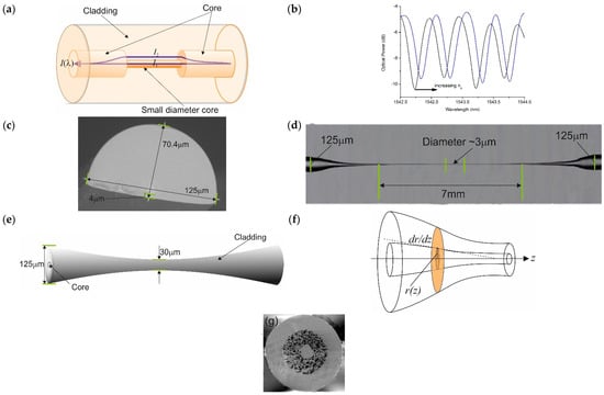 Mode coupling in tapers is investigated using the slowness criteria [70], which determines whether a taper is adiabatic or non-adiabatic. The magnitude of the gradient of the radius along the taper needs to be smaller than the adiabatic length scale [71] so that a strong mode coupling occurs [70,71]. The strength of a couple for the taper is governed by with , see Figure 3f. Here, zb is the beat length between two modes with propagation constants of β1 and β2, and r is the radius of the fiber along the taper, is the adiabatic length-scale criteria. The method to evaluate a taper is through using the finite element method [72]. The tapers are fabricated using several methods, such as a fusion splicer or the flame method with a controlled pulling mechanism, or specific equipment like automated glass processor workstations, such as Vytran or FiberBridge Photonics [73,74,75,76].