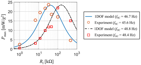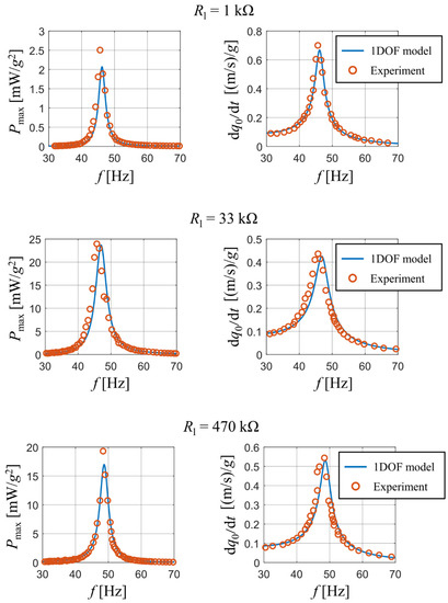 The output of analytical model matches perfectly with the experimental results for both the short-circuit frequency fSC and the open-circuit frequency fOC of this coupled electromechanical system. The short-circuit and open-circuit frequency are the first resonant frequencies in case of = 0 and → ∞, respectively. The match of simulation results with the measured ones for various values of resistive load and kinematic excitation at both the short-circuit frequency fSC and the open-circuit frequency fOC is shown in Figure 4. Both states correspond with operations slightly below and above the resonance excitation for various values of resistive load, which determine the value of actual resonance frequency.