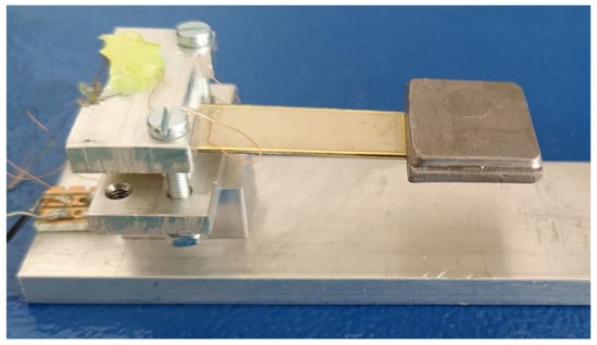 The experiment with PZNN-PLZT bimorph (see Figure 5) was conducted in a laboratory at Brno University of Technology with a partial electrode length (there are no electrodes under the tip mass). Geometrical parameters of this bimorph are summarized above in Table 1. The bimorph’s piezoelectric layers were made of PZNN-PLZT, which is in detail described in [6], and the substrate was made of a common steel shim. Properties of these materials are listed above in Table 2. Electrodes were made using a thin silver tape casting. Since the silver electrodes were substantially thinner than other layers, they were not accounted for in the calculation of single DOF model parameters due to their negligible effect on the net mass and the beam’s stiffness. The bimorph had an experimentally determined damping ratio = 0.025 via an impulse response in the short-circuit state.