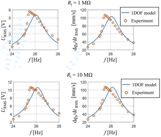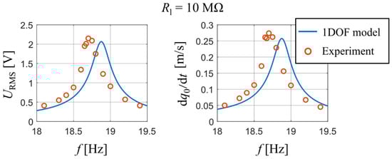 A comparison between the measured data and the calculated output of the analytical model is shown in Figure 6, namely the RMS values of output voltage and those of velocity of the bimorph’s free end as a function of forcing frequency. The results are displayed for two values of used resistive load: 1 MΩ and 10 MΩ. The measured data shows a weak non-linear softening dynamic behavior; however, the analytical single DOF model with linearized parameters still shows a very good degree of accuracy for both used resistive loads in terms of achieved amplitudes.