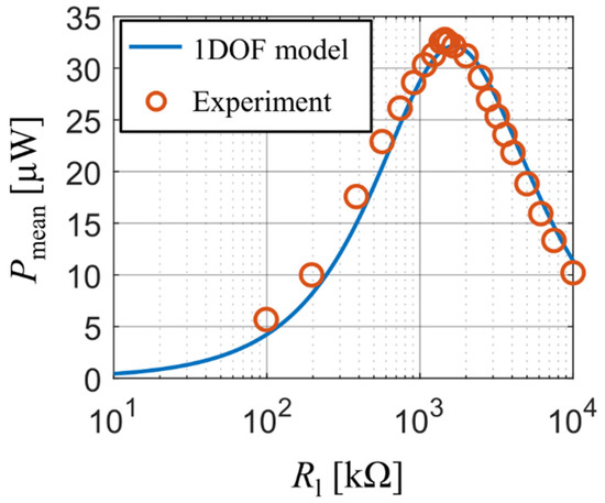 Our experiment also tracked the values of generated electrical power as a function of used resistive load. During the measurement, the forcing frequency was adjusted for each value of resistive load so that it matched the bimorph’s actual first resonant frequency. Both the analytical model and the experiment show (Figure 7) that the optimal resistive load is approx. 1.5 MΩ and, at the same time, also the maximal values of generated electrical power calculated with the single DOF model agree with experimental data at all used values of resistive load. The reader should note here that the curve from the analytical model is slightly shifted to higher values of which is, similarly as in the previous experiment, due to the used approximative function , which makes the beam model behave slightly stiffer.