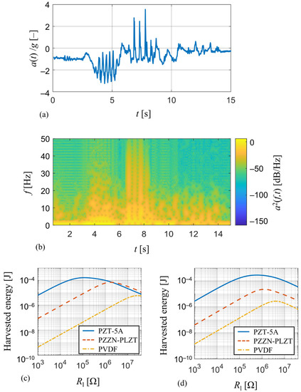 (a) Measured acceleration of a random movement of a human wearable and (b) its spectrogram; a comparison of harvested electrical energy from the human forearm movement among (c) the piezoelectric harvesters used in the experiments and (d) the tuned piezoelectric harvesters from Section 4.1 for different values of resistive load.