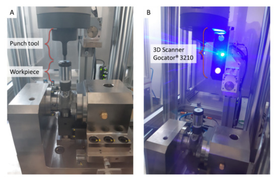 Punching machinery: (A) punch tool and pump workpiece, (B) Gocator® 3210 3D scanning sensor.