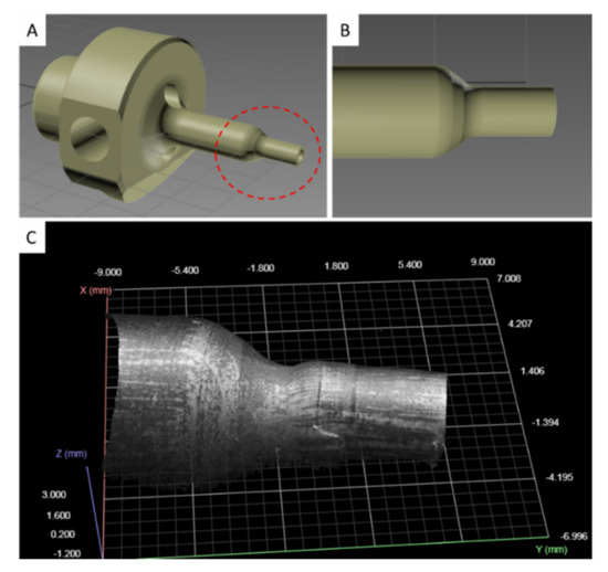 The punch tool consists of two cylindrical ends, of which the one having a larger diameter serves to clamp it to the machine, while the other is the working region. The 3D model of the punch tool is provided in Figure 3, in which the working region is highlighted by a dashed red line (Figure 3A). During the machining cycles, the working surface of the punch (Figure 3B) undergoes progressive deformations (Figure 3C). Three-dimensional scans of these surface deformations, suitably processed using ML algorithms, can be exploited to predict the RUL of the punch tool.