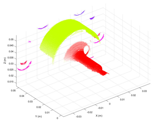 Three-dimensional scans obtained as discussed above were preprocessed in the form of 3D point clouds. Due to reflections from the metallic surface, raw 3D point clouds may be corrupted by artefacts, i.e., spurious 3D points. To overcome this issue, the first preprocessing step was to segment each raw point cloud into clusters, considering a minimum Euclidean distance between 3D points from different clusters, as represented in Figure 4. Then, the clusters were filtered based on the number of 3D points, keeping the two clusters with the greater number of points. The resulting 3D point cloud, provided in Figure 5, is composed of two main segments. The points located at y < 0.01 form the working surface, whereas those located at y > 0.03 represent the so-called best-fit surface used in the following step for point cloud registration. Although the 3D scan system is firmly clamped to the machine structure, continuous vibrations can produce slight misalignments between 3D point clouds. A rigid registration step was utilized to correct such misalignments.