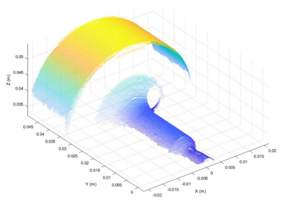 The semi-cylindrical surface with the largest diameter, shown in Figure 5 (i.e., 3D points with y > 0.03), was used as the best-fit reference surface for registration, since this surface was the least subject to deformation during punching operations. The iterative-closest-point (ICP) algorithm, originally suggested by Besl and McKay [42], was used to register the best-fit surfaces of segmented point clouds.