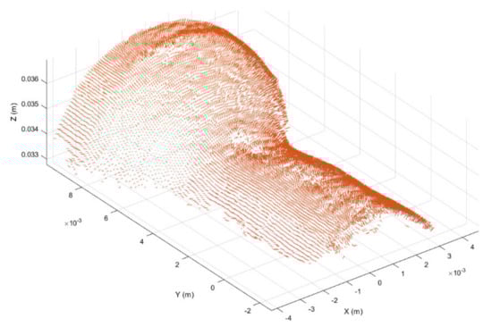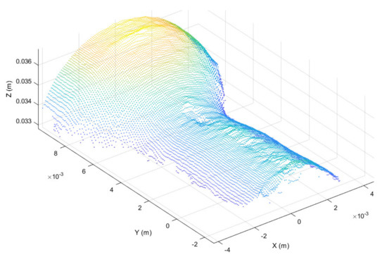 Once registered, the point cloud was cropped to take only the working region, thus highlighting the surface deformation, as shown in Figure 6. In addition, in order to further highlight the working surface deformations, for each point belonging to the cropped point cloud the surface normal vector was considered [45], obtaining the normal representation shown in Figure 7.