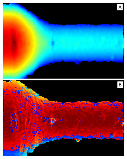 To exploit most of the DNN feature extraction capabilities, depth and normal vector representations were transformed into two-dimensional maps, reported in Figure 8, i.e., depth map (Figure 8A) and normal vector map or normal map (Figure 8B), respectively.
