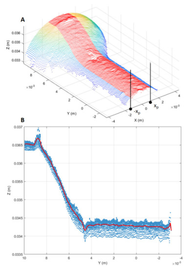 Secondly, the selected point-cloud region was projected onto the YZ plane. Thirdly, the longitudinal profile was estimated averaging the projected region along the Z-axis direction (Figure 9B).