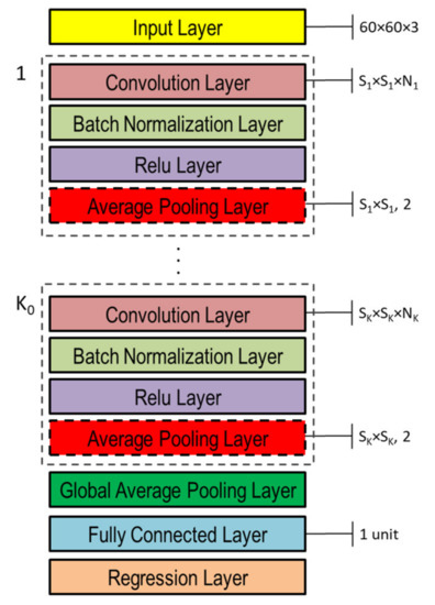 The DNNs used in this study to capture the representation information from preprocessed inputs, i.e., depth and normal maps provided as false-color images (Figure 8), were based on CNN [46]. Both single- and double-head DNNs were investigated, whose general architectures are shown in Figure 10 and Figure 11, respectively. Basically, they are composed of an input layer receiving depth or normal maps, resized to 60 × 60 pixels color (3-channels) images, followed by ( and in the double-head case) blocks including the following four layers: (1) convolution, (2) batch normalization, (3) rectified linear unit (ReLU), and (4) global average pooling.