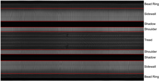 Defect detection of industrial products is an important research content in the field of machine vision. It is a technology that uses machine vision equipment to obtain images and judge whether there are defects in images. Due to the complex production environment in the tire manufacturing process, there may exist various defects, such as impurities, blisters, and other issues. These quality issues are difficult to detect through surface detection. Thus, an X-ray sensor is commonly used to inspect the inner structure of tire. In tire industry, it is a crucial process for detecting defective tires through X-ray images [1]. This procedure can effectively prevent tires with quality issues from entering the market and reduce the risk of road problems [2]. During X-ray imaging, a tire is first conveyed to a lead shield room. Then, the door is closed. Next, the tire is hung on a tire expansion mechanism which is responsible for holding up and rotating the tire by . Meanwhile, an X-ray source stretches into the tire and emits X-rays. A u-shaped detector receives the X-rays and performs imaging. Finally, the tire is delivered out from the lead shield room and the whole process ends. The imaging equipment sketch is shown in Figure 1. Figure 2 is an entire defect-free X-ray image displayed horizontally. An X-ray image can be divided into five areas: bead ring, sidewall, shadow, shoulder, and tread. The black areas in Figure 2 are shadow areas in imaging. They can be ignored during inspection. In the production process, various types of defects may occur. Typical defects in tire X-ray images are given in Figure 3.