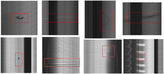 The experimental dataset employed in this study was obtained from tire X-ray images of an industrial production line. Tire X-ray images were taken by the X-ray machine in the factory and annotated by experienced workers. After cropping the primitive high-resolution images (Figure 2), the dataset was obtained. The size of images is . The dataset includes 21 types of examples in total such as foreign matters, blisters, and so on, covering all of the types provided from the tire factory. They are integrated into two types—normal and abnormal types—for our research. The two types of images are shown in Figure 8. To simulate the condition that there are a large number of defect-free samples and a small number of defect samples in the real industrial scenario, 20,000 defect-free images were selected as the training set to train the reconstruction model, whereas 2077 defect images and 3947 defect-free pictures were selected as the test set for testing the defect detection effect.