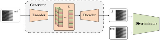 As a widely used model in semi-supervised learning and unsupervised learning, AE can be used to complete the task of image reconstruction. It has good performance in image denoising, anomaly detection, and data dimensionality reduction. However, in the process of encoding and decoding, some information will be lost. AE cannot always discard information properly. As a result, reconstructed images may retain some defects or become too fuzzy. Since Goodfellow et al. [33] proposed GAN in 2014, it has developed rapidly and has gradually displaced AE. GAN can generate clearer images than AE. In this section, we design a novel image reconstruction model based on GAN, as is shown in Figure 5.