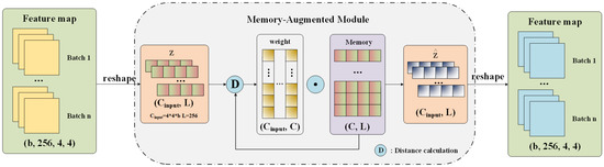 Similarly, the first layer of the decoder (Table 2) is discarded and obtained by the memory-augmented module is directly input into the decoder to reconstruct images after being reshaped into . Memory in the memory module (Figure 6) is initialized as a tensor. The memory items are set as trainable parameters during the training phase, so they will be updated along with other layers. Intuitively, representations stored as memory items in the memory are updated during training.