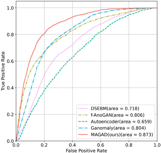 ROC curves of the five methods on the tire X-ray test dataset are plot for comparison. As shown in Figure 9, the AUC of the proposed method reaches 0.873. The introduced memory-augmented module and image-inpainting strategy are significantly more effective for detection.