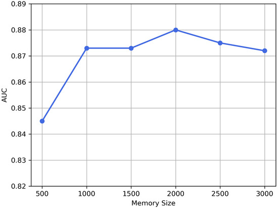 Memory size. The memory is an important part in the memory-augmented module. We study the robustness of the proposed method to the memory size, that is, the storage capacity C of the memory module. We conduct experiments by using different memory size settings and show the AUC values in Figure 10. From Figure 10, memory in the size of 500 cannot effectively memorize the representations. Sizes of above 1000 enable the model to produce ideal reconstruction results. A larger size will contribute to higher computational complexity with approximate performance, so 1000 is enough.