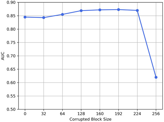 Size of corrupted blocks. We investigate the performance of the inpainting strategy under different sizes of corrupted blocks, as shown in Figure 11. In fact, size 0 means doing reconstruction without inpainting strategy. The larger size means a larger corrupted area in an image and more information requires being inferred through the context by the reconstruction model. From Figure 11, with the expansion of the area, AUC is gradually increasing. Notably, size of 256 means that the input of the reconstruction model is entirely noise, so there will not be an ideal reconstruction result, showing a poor performance (AUC = 0.62). The final size is set to 192, according to the experiments.