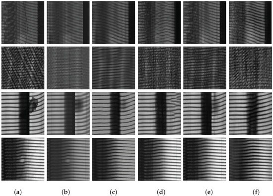 As shown in the second line of Figure 12, for these disordered patterns, it is challenging for PCA to extract features because PCA compresses each image individually. PCA is unable to find regularities in these images. Similar to defects of 0-Degree-Scatter, AE fails to reserve the tread pattern and even makes the reconstruction image fuzzy. When the structure of generator and discriminator is adopted, the reconstruction performance is significantly improved.