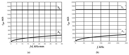 Phase velocity dispersion curves of Lamb wave fundamental modes calculated by SAFE method: (a) versus f·d, kHz·mm; (b) versus frequency f in d = 150 µm thickness PVC film.