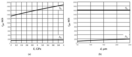 The calculations were performed at the fixed frequency 50 kHz. In Figure 2a, dependencies of the phase velocities of the A0 and S0 modes for the fixed film thickness d = 150 µm and for the fixed Young modulus E = 2.937 GPa (Figure 2b) are presented. The obtained results show that as expected the phase velocity of the S0 mode strongly depends on the Young’s modulus, but almost is not affected by the thickness d of the film. The phase velocity of A0 mode depends on both parameters, but the thickness of the film influences the phase velocity much more than the phase velocity of the S0 mode.