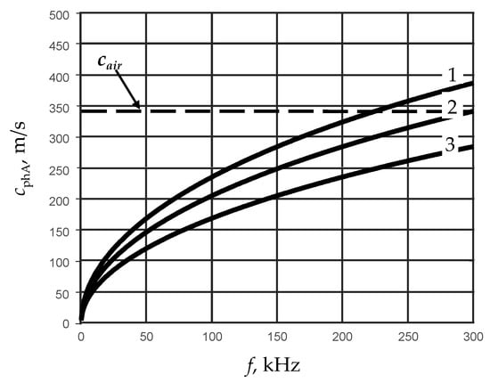 Phase velocities of A0 mode in PVC films of different thickness: 1—d = 200 μm, 2—d = 150 μm, 3—d = 100 μm.