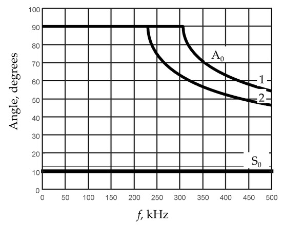 Efficiency of air-coupled excitation of S0 mode is lower than of the A0 mode, especially in the lower frequency range, due to much higher velocity of this mode, the wavelength is much longer and consequently the ratio of the excitation area diameter to the wavelength is much smaller. In such a case, the efficiency of excitation reduces. Therefore, for excitation of the S0 mode, we have selected the frequency range higher than 100 kHz. For this, we propose to use air-coupled flat ultrasonic transducer deflected from the normal to the surface of the film at the angle given by Snell’s formula (Equation (10)).
