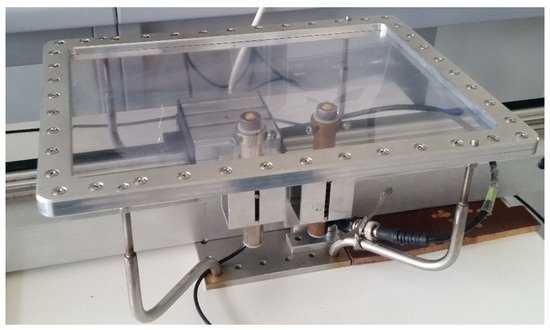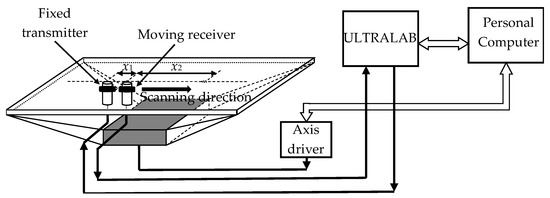 During experiments, the phase velocities of S0 and A0 Lamb wave modes were measured. Considering that S0 mode is rather difficult to excite by the air-coupled method, the contact excitation and reception was used. For that contact point type transducers with a hemispherical plastic tip and with 180 kHz resonant frequency were exploited. Experiments were performed using a scanner Standa 8MTF-75LS05 (Standa Ltd., Vilnius, Lithuania) and the ultrasonic measurement system “Ultralab” [27] (Figure 6). All units including the ultrasonic transducers and the ultrasonic system “Ultralab” were developed at Ultrasound Research Institute of the Kaunas University of Technology. The ultrasonic transducers possessed small diameter plastic tips that allowed the performance of dry contact B-scans which did not damage the PVC film.