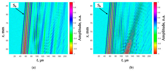 B-scans of the measured amplitudes of the Lamb wave signals in the PVC films of different thickness: (a) d1 = 150 µm, (b) d2 = 200 µm.
