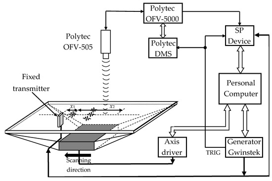 The A0 mode was excited by a contactless air-coupled method and registered by Polytec 500 laser interferometer (Polytec GmbH, Waldbronn, Germany) (Figure 8).