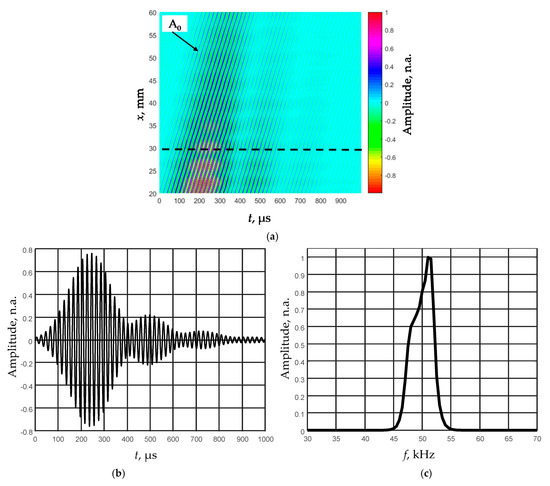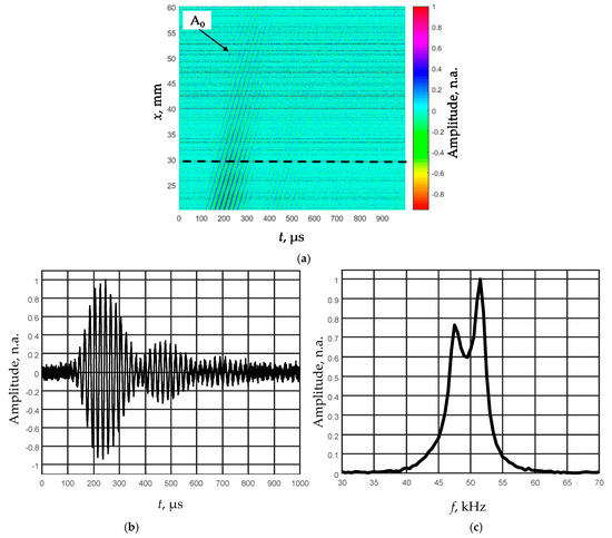 The normal displacement waveforms of the film were registered by the Polytec laser interferometer. To improve the signal-to-noise ratio at each measurement point, eight signals were averaged. The film was scanned in the x-axis direction when the distance from the transducer was x1 = 20 mm and the probing distance was x2 = 40 mm, the scanning step was dx = 0.1 mm. Figure 9a shows the obtained B-scan image by a non-contact scanning of the d1 = 150 µm thick PVC film. The observed amplitude spectrum of the relatively short ultrasonic pulse due to influence of the quarter-wavelength matching layer possesses two peaks, and one of them is at the frequency 52 kHz (Figure 9c).