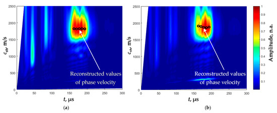 The phase velocities cphA of the A0 mode were found from the filtered B-scan (Figure 10a) at the excitation frequency f = 50 kHz using the proposed algorithm. Their values are cphA = 147.8 ± 2.9 m/s for the film d1 = 135 µm and cphA = 170.8 ± 3.4 m/s for the film d2 = 180 µm.