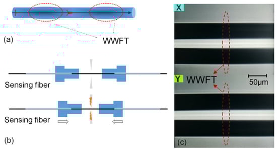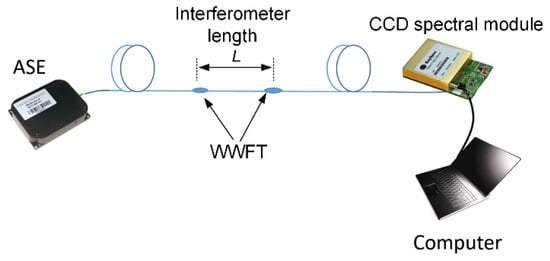 Next, two WWFTs are sequentially embedded into the sensing SMF to construct an intermodal interferometer, as shown in Figure 2. For the experimental test, the WWFT-based interferometer is connected with ASE light source (Golight Tech., ASE-C&L-10, Shenzhen, China) and CCD spectral module (Bayspec Inc., FBGA-1525-1610, Fremont, CA, America) for transmission spectrum acquisitions. The acquired spectra are then analyzed by using a LabVIEW program for Fast Fourier Transform (FFT), and the peak amplitudes/phases of the spectra after FFT are individually discussed. The schematic diagram of the experimental setup is shown in Figure 2.