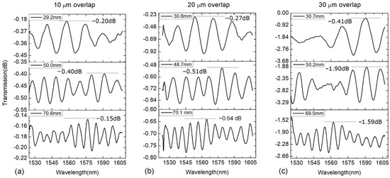 Transmission spectra of WWFT-based interferometers with different overlap values of (a) 10 μm, (b) 20 μm and (c) 30 μm, respectively.