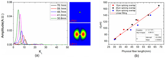 (a) Spectra after FFT for the WWFT-based interferometers with different interferometer lengths, inset: Electric field distributions of LP01 and LP11 mode; (b) Optical path difference versus interferometer length with overlaps of 10 μm, 20 μm and 30 μm, respectively.