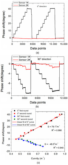 Next, the continuous data acquisition is conducted, and the dynamic results are shown in Figure 6. The peak phases of spectra after FFT are continuously acquired as curvature varies between 0.48~0.94 m−1 (0° direction) °and 0.48~0.76 m−1 (90° direction). Figure 6a shows the phase shift when the WWFT-based fiber is placed at the initial position (defined as 0° direction). It can be seen that, when the curvature increases, the phase shift of sensor 1# is enlarged synchronously. Meanwhile, sensor 2# keeps almost unchanged, indicating that the curvature detections are independent between two sensors. Next, when the fiber sensor 1# is rotated to 90°, as shown in Figure 6b, we can see that the phase of sensor 1# shifts to the negative direction and presents different phase shifts when compared with those in 0° direction. This phenomenon signifies that the proposed sensor has diverse responses in two orthogonal directions, which can be further potentially applied for vector curvature sensing. Besides, for the 90° direction, we can also observe the cross-talk for sensor 2#. Theoretically speaking, no phase shift should occur for sensor 2# since no curvature is applied. This experimental phenomenon may be explained by the resolution ability of spectra after FFT, which is determined by the measurable spectral range of the CCD spectral module. As shown in Figure 5c, the peak amplitude of sensor 2# is easily affected by that of sensor 1# when the spectrum resolution ability is limited, and the cross-talk becomes more significant when the sensitivity decreases. Finally, the sensitivities in both 0° and 90° directions are shown in Figure 6c. The curvature sensitivities are determined to be 79.1°/m−1 and −48.0°/m−1, respectively. The different curvature sensitivities are mainly due to the anisotropic distribution of the excited high-order mode (LP11) in different axes. It should be explained that most of previous works relating to optical fiber curvature sensors are based on wavelength demodulation in unit of nanometer (nm) or amplitude demodulation in unit of decibel (dB). While in this study, the curvature sensing is realized based on phase demodulation in unit of degree (°). It should be noted that the wavelength and phase are two independent parameters which are inconvenient to convert to each other in our demodulation system. Hence, it is difficult to compare the curvature sensitivity performance presented in this study with the previously reported studies. Here, the sensitivity performance comparison is not discussed.