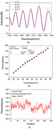 Finally, the temperature cross-sensitivity of the presented WWFT-based interferometer is discussed. The sensor is heated from 22.0 °C to 37.5 °C. Figure 7a shows the transmission spectra of the sensor with interferometer length of 41.2 mm and overlap value of 20 . We can hardly observe the wavelength shift with wavelength demodulation scheme. Then, based on phase demodulation scheme, the phase shift versus temperature is indicated in Figure 7b, and the temperature cross-sensitivity is determined to be 1.37 °/m−1. When compared with the curvature sensitivities mentioned above, the temperature cross-sensitivity is insignificant. Besides, the phase fluctuation is monitored for 4 min at 22 °C, and the result is shown in Figure 7c. The recorded standard deviation is determined to be 0.071°. Here, we use three times the standard deviation as the phase resolution, i.e., 0.213°. Hence, the curvature resolutions of the proposed sensor are determined to be around 0.213/79.1 = 2.69 × 10−3 m−1 at 0° direction and 0.213/48.0 = 4.44 × 10−3 m−1 at 90° direction.