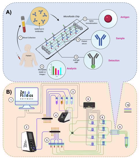 A traditional ELISA was performed using a 96-well microplate (Corning Inc., Tewksbury, MA, USA) to compare those results against the ones obtained with our automated ELISA on-chip. Firstly, 100 µL of a PBS suspension containing 1 µg/mL of the complete spike protein (Sino Biological Inc., Chesterbrook, PA, USA) was deposited in each well, followed by a 1 h incubation at room temperature. Afterward, three washes were made using a wash buffer (WB = PBS containing 0.05% TweenTM 20 (Thermo Fisher Scientific, Waltham, MA, USA). Blocking was made by incubating 200 µL of 5% skim milk (Sigma-Aldrich, Burlington, MA, USA) at room temperature for 1 h. Subsequently, another round of three washes was carried out using the WB. Then, the serum samples (1:100 dilution) were added to the microplate and incubated for 1 h at room temperature to later be washed three times with WB. Next, a 1 h incubation of 100 µL of anti-human IgG conjugated with HRP (1:15,000 dilution; Thermo Fisher Scientific, Waltham, MA, USA) was performed, at room temperature, to identify the presence of anti-spike antibodies, followed by three washes with WB. Finally, 100 μL of 1-StepTM Ultra TMB-ELISA (Pierce Biotechnology Inc., Rockford, IL, USA) was used to reveal the reaction, and the reaction was stopped by adding 100 μL of 1 M H2SO4.