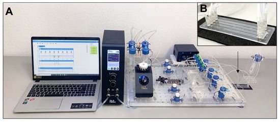 The methodology followed in the automated ELISA on-chip assay and a diagram that illustrates the experimental setup implemented are displayed in Figure 1A,B, respectively. The reagents used and the conditions at which these were passed through the microfluidic device are specified in Table 1 and Figure S1. Commercially available microfluidic instrumentation was used to assemble the experimental setup that enabled the automation of our ELISA on-chip assay from antigen immobilization to the detection of anti-SARS-CoV-2 antibodies. A PS microfluidic device with four straight channels (50 µL volume capacity/channel; microfluidic ChipShop, Jena, Germany), a flow control unit (Zen Fluidics, Laredo, TX, USA), a 12/1 bidirectional microfluidic rotary valve (Zen Fluidics, Laredo, TX, USA), a microfluidic valve controller (Zen Fluidics, Laredo, TX, USA), a set of 4 pinch valves (Zen Fluidics, Laredo, TX, USA), and a set of four 3/2-way switching valves (Zen Fluidics, Laredo, TX, USA) were the main components that constitute this setup. All protocol steps were programmed using Zen Lab software (Zen Fluidics, Laredo, TX, USA), which also served to control all the components of the setup. All the pneumatic, fluidic, and electrical connections are also specified in the diagram depicted in Figure 1B and Figure S1. Additionally, a photograph of the experimental setup is shown in Figure 2.