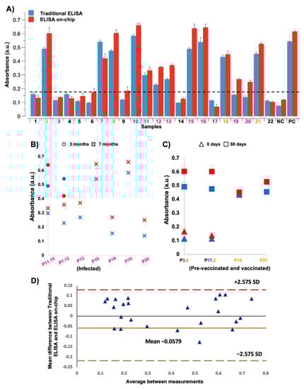Absorbance comparison between the traditional ELISA and our automated ELISA on-chip. The resulting colorimetric reactions from both immunoassay formats were analyzed with a microplate reader. (A) Measured absorbance of the 22 serum samples, 1 negative control (NC), and 1 positive control (PC). The sample number is colored according to the following code: healthy subjects in black, pre-vaccinated subjects in purple, vaccinated subjects in orange, and infected subjects in pink. The dotted line indicates the absorbance limit measured in serum samples from healthy subjects. (B) Measured absorbance of the serum samples collected from COVID-19 patients 3 months (circle) and 7 months (cross) after infection. The sample color and patient code are in accordance with the one presented in Figure 3A. Patients with a code containing 2 numbers provided two different samples (e.g., patient P11.15 provided samples 11 and 15). (C) Measured absorbance of the serum samples collected from vaccinated individuals prior to being vaccinated (triangle) and 60 days after vaccination (square). The sample color and patient code are in accordance with the one presented in Figure 3A. Patients with a code containing two numbers provided two different samples (e.g., patient P3.8 provided samples 3 and 8). (D) Bland-Altman plot that shows the mean difference between the measurements obtained from the traditional ELISA and ELISA on-chip when the colorimetric reactions were analyzed by a microplate reader at 450 nm. For this analysis, 99% limits of agreement (±2.575 SD) were used.