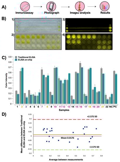 (A) Analysis methodology: First, the immunoassay is performed. Then, a photograph of the substrate, either a microplate or a microfluidic device, is acquired with a smartphone, followed by a color intensity analysis of the resulting colorimetric reactions using ImageJ software or any other similar software. Finally, the results are plotted and compared against the ones obtained from other samples. (B) Photographs of the resulting reactions when performing (1) our automated ELISA on-chip, (2) the traditional ELISA, and (3,4) its corresponding processed images. (C) Comparison of the results obtained by image analysis of the colorimetric reactions with both immunoassay formats from the 22 serum samples, 1 negative control (NC), and 1 positive control (PC). The sample number is colored according to the following code: healthy subjects in black, pre-vaccinated subjects in purple, vaccinated subjects in orange, and infected subjects in pink. (D) Bland-Altman plot of the results obtained from ImageJ analysis using both immunoassay formats that shows the mean difference between the measurements obtained from the traditional ELISA and ELISA on-chip. Here, 99% limits of agreement (±2.575 SD) were used.