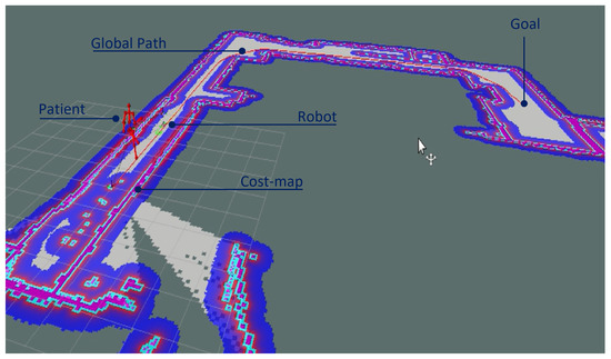 Once the mapping is complete, the system is ready to perform autonomous localization and path planning. The task of path planning for a mobile robot consists of determining the sequence of maneuvers that the robot must perform to move from the starting point to the destination while avoiding collisions with obstacles. In the ROS, it is possible to plan a trajectory based on occupancy grid mapping, i.e., using the messages obtained from the slam_gmapping node. This planner is a node named move_base, which is from the ROS move_base package. Although this planner provides a global and local plan for navigation, there are other local planners that can provide better results and can be added as plug-ins for the move_base node. As mentioned above, in this study, the teb_local_planner has been used as a plug-in for local planning. The local plan is essential in a system that is used in a real environment because it allows replanning of the trajectory during execution, thus providing the system with the ability to avoid unexpected obstacles. The teb_local_planner implements the Timed Elastic Band (TEB) algorithm proposed in [